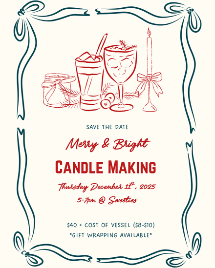 You're invited to our holiday candle making workshop December 11th, 2025 5-7pm. Join us for a cozy holiday candle workshop where you’ll create your own hand-poured candles — the perfect gift (or little luxury to keep for yourself).